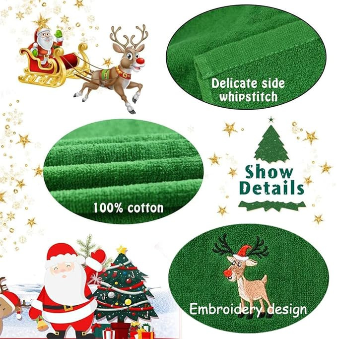 [100% Cotton Towels ] These Christmas dish towels are made of cotton which is soft for you to touch and comfortable for you to use, not easy to deform or damage; they have high water-absorbent quality, also very durable and reusable��[Christmas Decorations]The Christmas themed embroidery and beautiful color on these towels provides you a festival feel at home. Add the finishing touch to your kitchen with this charming cotton towel. You can place the towels on Christmas dinner table, bathroom, wash basin and kitchen, etc as festival decor to illuminate your festival.��[Widely Usage] Suitable for bathroom (washing your hand & face), wash basin (drying hands,face,etc), kitchen (cleaning the table, dishes, etc). It is a satisfied choice for many families. Having kitchen towels around is a complete must for every household. They are invaluable helpers when it comes to accidental spills, or washing and cleaning up after a meal.��[Great Gift Choice]Each set contains 3 Christmas towels, white, red, and green; Perfect gift for Christmas, Thanksgiving, party, holidays, birthdays, housewarming, hostess gifts and more.