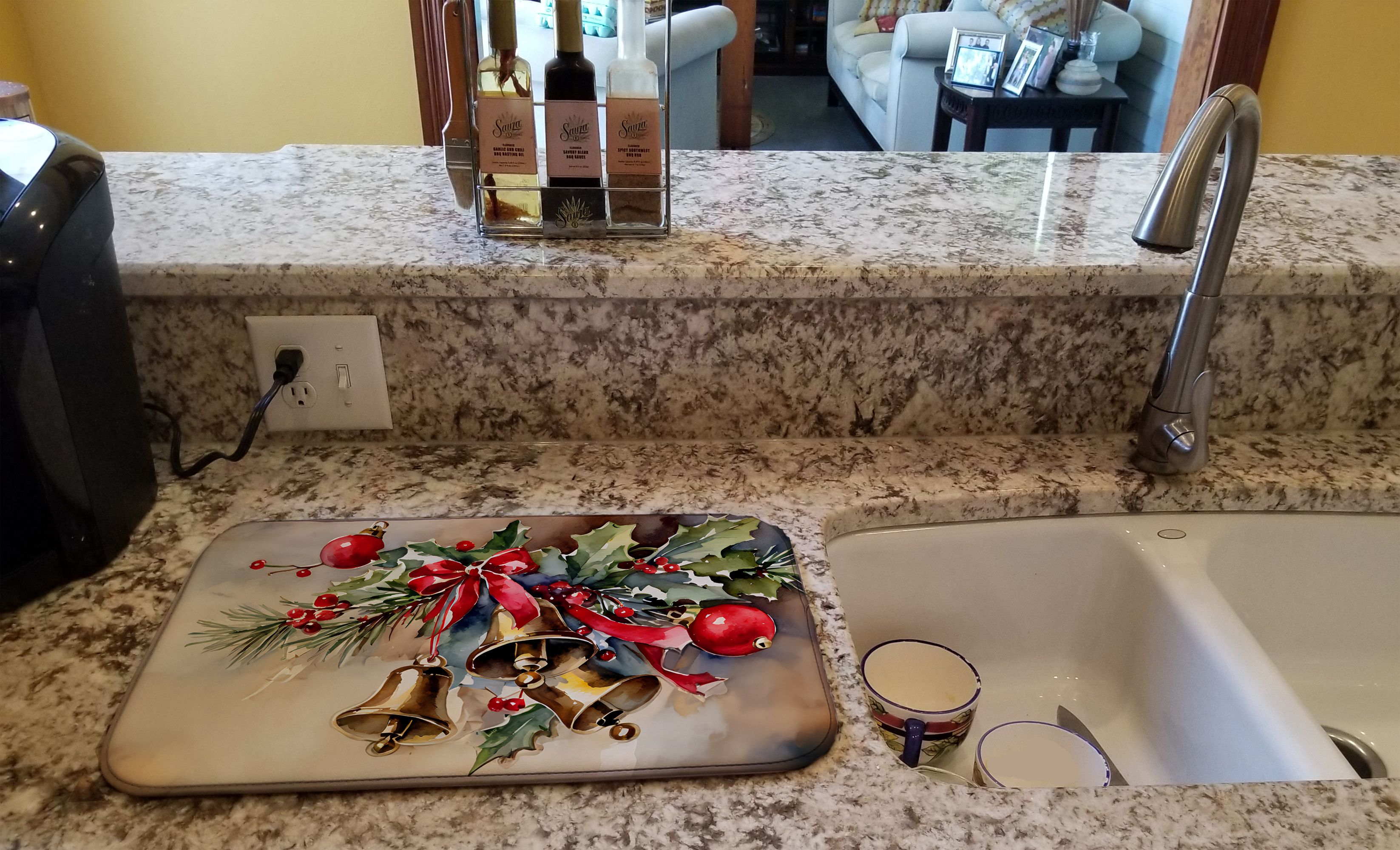 Celebrate Christmas with this Christmas Dish Drying Mat. Say goodbye to messy countertops and soggy dish towels with our innovative dish drying mat. Our high-quality dish drying pad is designed to keep your countertops dry while offering a stylish and efficient solution. Whether you're air drying dishes, glasses, stemware, silverware, pots, pans, bottles, or even fruits and vegetables, our dish mat is the perfect choice. The 14 inches x 22 inches size fits most counters and dish drying racks, and the non-slip design ensures stability. Made with water-absorbent polyester and a polyurethane foam insert, our dish drying mat is not only functional but also durable. It's machine washable and printed in the USA for long-lasting use. The beautiful artwork adds flair to your kitchen decor, making it a perfect housewarming gift or present for any occasion. Upgrade your kitchen experience with our absorbent and versatile dish drying mat.